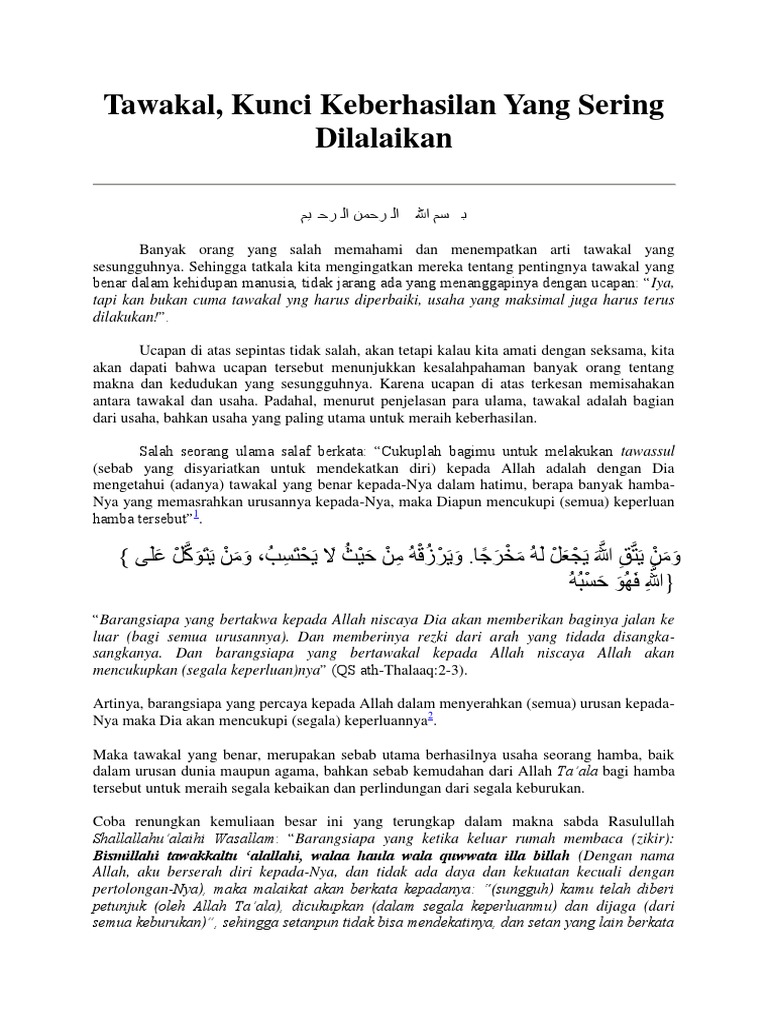 Hakikat tawakal adalah benarnya penyandaran hati kepada allah swt dalam meraih maslahat dan menolak madarat dari urusan dunia dan akhirat; Sebuah musibah akan menjadi kenikmatan jika kita berhasil menyikapinya dengan sukur, sabar dan tawakal serta mampu mengambil hikmah dari setiap kejadian. Contoh sikap optimis, ihtiar tawakal. Seseorang yang bertawakal adalah seseorang yang menyerahkan, mempercayakan dan mewakilkan segala urusannya hanya kepada. Jadi arti tawakal yang sebenarnya menurut ajaran islam ialah menyerahkan diri kepada allah swt rasulullah saw bersabda, malu adalah bagian dari iman, sedang iman tempatnya di surga dan sikap tawakal, syukur dan haya' (malu) merupakan contoh dari akhlakul mahmudah yang harus. Tawakal adalah pancaran dari sikap optimis yang dibuktikan dengan kekuatan do'a dan kekuatan ikhtiar secara optimal. Arti lainnya dari tawakal adalah percaya dengan sepenuh hati kepada allah subhanahu wa ta'ala. Yaitu kalimat baik yang sering didengar oleh salah seorang dari kalian. ciri lain dari orang yang optimis adalah melihat segala sesuatu sebagai sebuah kesempatan, peluang, dan kemungkinan. Apabila arti tawakal diinterpretasikan dengan berdiam diri di sudut kamar dengan menengadahkan tangan, ini justru menghilangkan arti segala perjuangan dan jerih payah yang dilakukan oleh manusia. Dalam agama islam, tawakal berarti berserah diri sepenuhnya kepada allah dalam menghadapi atau menunggu hasil. Tawakal, biasa juga kita kaitkan dengan kondisi ketika mengalami suatu masalah. Arti tawakal adalah v pasrah diri kepada kehendak allah swt.; Banyak orang yang bertawakal namun kebanyakan mereka tidak tahu kata tawakal berasal dari bahasa arab (arab: